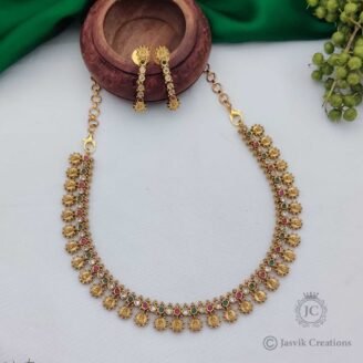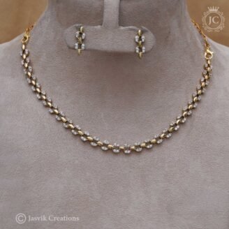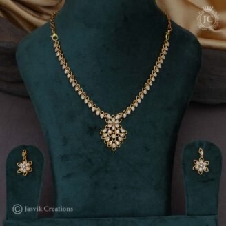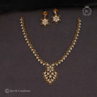 This is an exquisite necklace set featuring a beautiful floral pendant design. The necklace is a single strand of what appears to be American Diamond (AD) stones, each set in a small, ornate, gold-toned frame that connects to the next, forming a delicate chain. The centerpiece is a stunning floral motif, made of five petal-like…