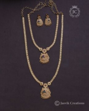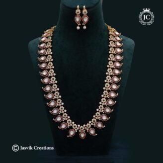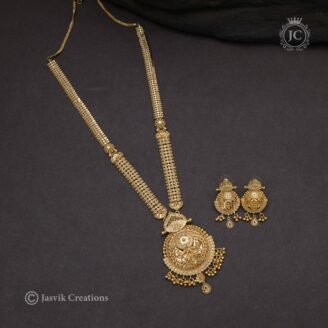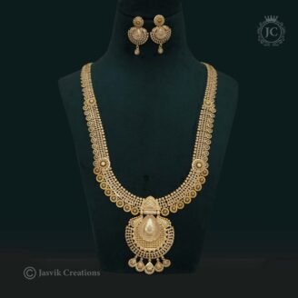 0 out of 5₹4,999Original price was: ₹4,999.₹3,499Current price is: ₹3,499.This is a magnificent and heavy bridal “Haram,” a long necklace, with a beautiful antique gold finish. The design is a classic “mango” motif, which is a highly popular and auspicious symbol in traditional Indian jewelry. The set includes a long haram and a pair of matching earrings. The haram is a long, continuous chain…