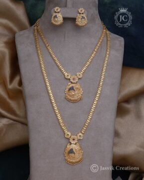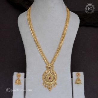 0 out of 5₹3,499Original price was: ₹3,499.₹2,999Current price is: ₹2,999.A Forming Haram is a long, traditional Indian necklace that replicates the luxurious look and feel of real gold jewelry at a more affordable price. The term “forming” refers to a specialized plating technology that provides a thick and durable layer of gold, making the jewelry a popular choice for special occasions. This type of…