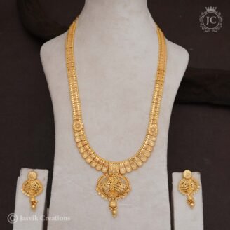 0 out of 5₹3,750Original price was: ₹3,750.₹3,199Current price is: ₹3,199.This is a magnificent Nakshi Bridal Haram, a long and opulent necklace designed for the most significant occasions, such as a wedding. The “Nakshi” refers to the intricate, traditional relief work or engraving seen on the metal, which often depicts deities and classical motifs. The necklace’s design is exceptionally detailed and full-bodied. The chain is…
