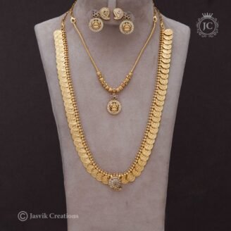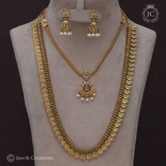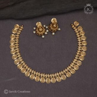 0 out of 5₹950Original price was: ₹950.₹450Current price is: ₹450.This is a traditional Antique Coin Lakshmi Necklace set, also known as a kasu mala or kasulaperu in South Indian jewelry. The set includes a matching pair of jhumka-style earrings. Necklace: Design: The necklace is crafted in a classic coin design, with each circular coin featuring an embossed image of Goddess Lakshmi seated on a…