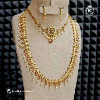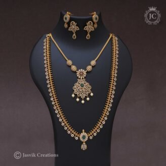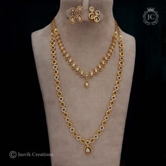 0 out of 5₹1,799Original price was: ₹1,799.₹1,299Current price is: ₹1,299.View this post on Instagram A post shared by Jasvik Creations (@jasvik_creation) This is a stunning Antique Combo Set of traditional Indian jewelry. It includes two necklaces (a short chain and a long haar) and two pairs of earrings. Long Necklace (Haar): A longer piece with a double-sided design, featuring a series of antique gold…