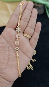 0 out of 5₹475Original price was: ₹475.₹375Current price is: ₹375.A delicate symphony of sparkle and grace, this gold bracelet features a central floral motif adorned with clear gemstones. Its finely linked chain and hook clasp offer both comfort and charm, making it a perfect accent for festive and formal occasions.
