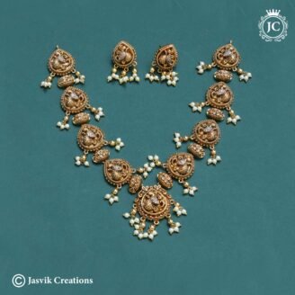 his is a traditional South Indian temple jewelry set with an antique matte gold finish. Pendant: A large, intricately detailed Lakshmi dollar (pendant) depicting the Goddess of Wealth. It is adorned with multi-colored stones (like ruby and emerald) and clustered pearl drops. Chain: Paired with a long, elegant micro-chain (often called a Zig-Zag or Wavy…