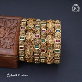 These are a traditional pair of South Indian Temple Earrings featuring a divine motif. Design: The earrings prominently display the idol of Goddess Lakshmi (a symbol of wealth and prosperity) seated within an ornate, teardrop-shaped frame. Style: They are a type of drop earring/stud, characterized by the decorative Lakshmi figure set within a detailed, golden…