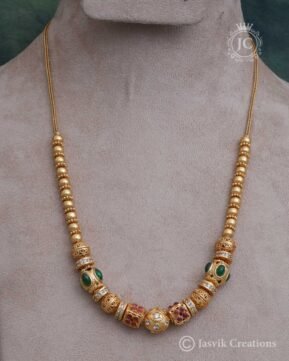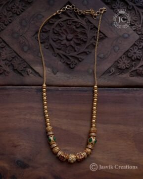 0 out of 5₹1,599Original price was: ₹1,599.₹999Current price is: ₹999.This is an Antique Gold Finish Ball Chain Necklace, typically made of a brass alloy with gold plating. Design: It features a traditional, long-style chain where the bottom half is heavily beaded with various antique-finished gold-plated balls. Embellishments: The centerpiece of the necklace is composed of larger, ornate beads, some of which are studded with…