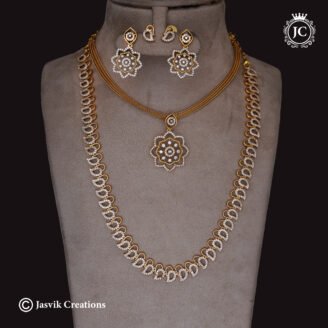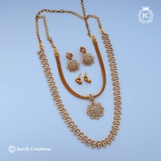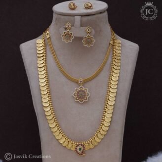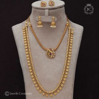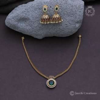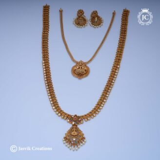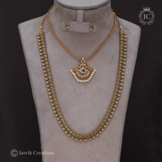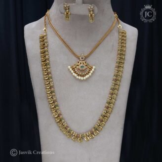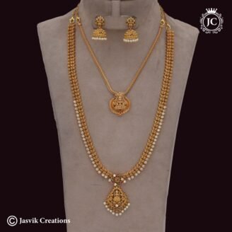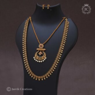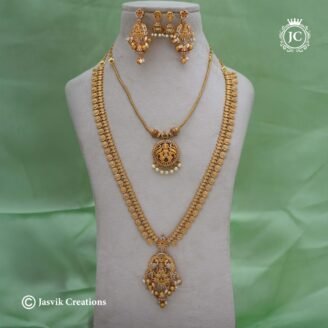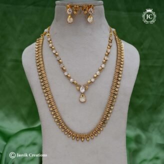 0 out of 5₹1,899Original price was: ₹1,899.₹1,199Current price is: ₹1,199.View this post on Instagram A post shared by Jasvik Creations (@jasvik_creation) Two layered necklaces: one grand temple-style piece with gold bead detailing, and one elegant short necklace with a teardrop-shaped pendant and white stones Matching earrings: teardrop design with white stone accents Finish: Antique Gold-Toned | Matte Microplated Material: Copper Alloy with synthetic stones…