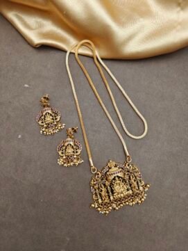0 out of 5₹1,799Original price was: ₹1,799.₹1,399Current price is: ₹1,399.A regal, traditional Antique Gold-Finish Combo Set featuring two distinct necklaces and a pair of jhumka earrings. The set includes a long pearl and gold-beaded haram and a complementing short chain necklace. Both pieces feature a Goddess Lakshmi temple pendant adorned with white and colored stones, symbolizing prosperity. The long necklace has a prominent central…