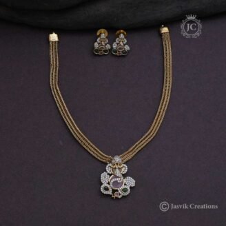 Necklace: A short, antique gold-toned necklace with a multi-strand chain (appears to be a snake or foxtail chain design). Pendant: A Lord Ganesha (Ganesh) motif, heavily embellished with clear/white stones (likely American Diamonds or Cubic Zirconia). The pendant also features small, multi-colored stones (pink, green, dark blue/black) to add contrast and detail. Earrings: Matching stud…