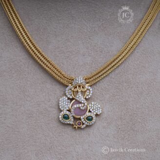“A traditional South Indian Attikai (short necklace) featuring an antique gold finish and an intricately crafted peacock-inspired circular pendant. The pendant is richly adorned with dazzling white stones (AD/CZ) and features a central multi-colored stone, likely an imitation of a ruby or emerald. It is elegantly framed by a hanging border of small pearls. The…
