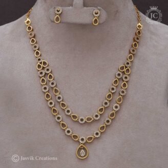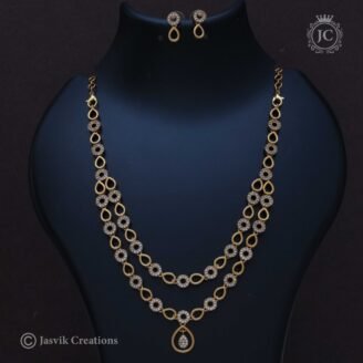 An elegant antique gold-toned necklace featuring a striking double-layer design. Both lines are composed of interconnected, alternating circle and teardrop-shaped links. The inner sections of the links are studded with sparkling white American Diamond (AD) stones, while the outer gold-toned border provides definition. The lower layer finishes with a single, dangling AD-studded teardrop pendant. The…