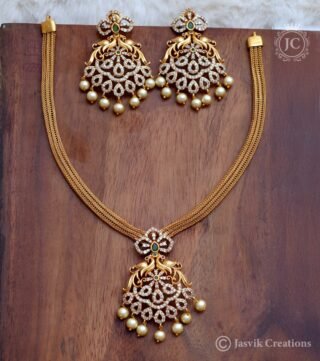 Premium Antique Necklace with Back Chain A regal blend of tradition and elegance, this premium antique necklace features a multi-strand gold-toned chain and a richly detailed pendant adorned with white and green stones, finished with graceful pearl drops. Paired with matching earrings and a secure back chain, it’s ideal for weddings, festivities, and timeless style.
