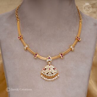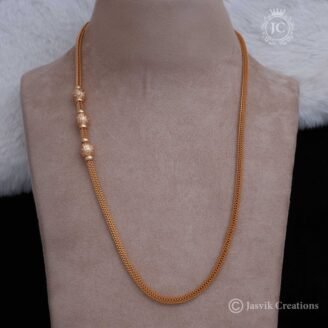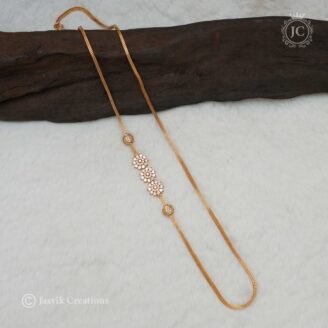 View this post on Instagram A post shared by Jasvik Creations (@jasvik_creation) This product describes a piece of imitation or fashion jewelry, likely a chain designed to be worn as a **Mugappu Chain** (also spelled **Mogappu** or **Mopu**), which is a traditional South Indian style of chain featuring a side pendant. Here is a breakdown…