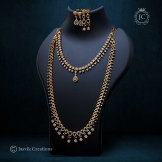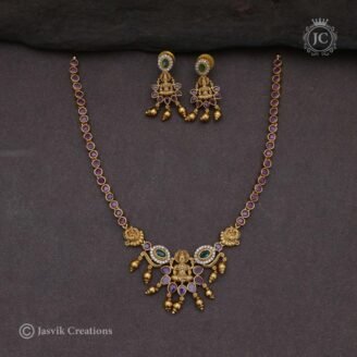 This is a premium-quality necklace set with a traditional and elegant design, featuring a necklace and a pair of matching earrings. Necklace Design: The necklace has a sleek and refined chain composed of alternating red and white stones, creating a delicate, continuous flow. The centerpiece is a prominent pendant with a floral-like design. It features…