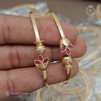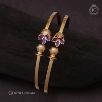 A poetic blend of tradition and artistry, this slender gold-toned kada features a striking lotus motif in rich purple enamel, paired with a textured pot-like charm that evokes sacred elegance. Its polished finish and openable design make it a graceful accent for festive wear or spiritual occasions.