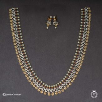 This luxurious long necklace (Haram) is a beautiful representation of traditional South Indian jewelry, combining classic motifs with vibrant stone work. Design: The necklace features two key elements repeated along its length: Manga (Mango/Paisley) Motifs: These traditional motifs are richly embedded with green and ruby-red stones and outlined with sparkling American Diamonds (AD). Coin Danglers:…