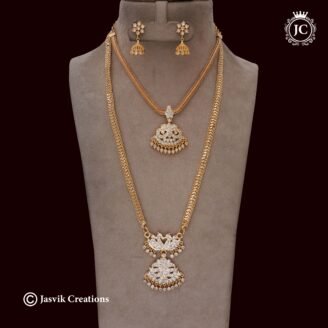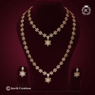 This is a comprehensive and luxurious four-piece combo set featuring brilliant American Diamond (AD) or high-quality cubic zirconia stones, set in a captivating floral cluster design. Set Components: The set includes a long haram (necklace), a shorter necklace (choker/medium length), a delicate matching bracelet, and a pair of coordinating stud earrings. Design: Each piece showcases…