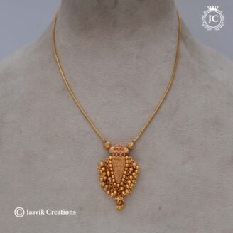 This unique necklace is deeply rooted in South Indian tradition, specifically inspired by the Nettipattam—the majestic gold caparison (forehead ornament) worn by elephants during temple festivals in Kerala. It captures the grandeur of Kerala’s cultural heritage in a wearable piece of jewelry. Key Design Features: Nettipattam Motif: The pendant is a miniature, intricately detailed replica…