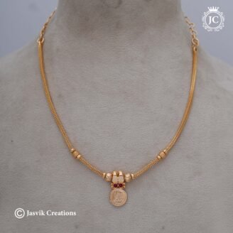 This is a minimalist and elegant piece that captures the essence of traditional South Indian “Kasu” (coin) jewelry in a simplified, everyday-wear format. The “Microplated” finish ensures a high-quality, long-lasting gold appearance that closely resembles real gold. Key Design Features: Single Coin Pendant: The centerpiece is a solitary gold coin (Kasu), likely embossed with a…