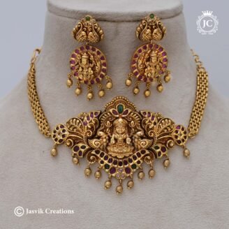 This magnificent set exemplifies classic South Indian Temple Jewelry, featuring the highly detailed Nakshi finish. The design is both traditional and opulent, perfect for grand occasions where a rich, antique look is desired. Goddess Lakshmi Motif: The centerpiece of the choker is a prominent, intricately carved figure of Goddess Lakshmi seated on a lotus, symbolizing…