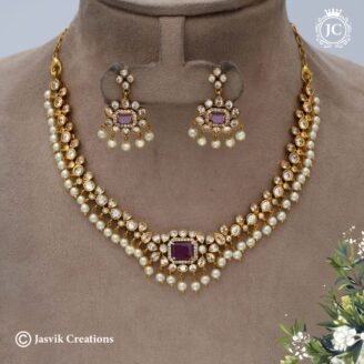 This is a stunning example of a Rani Haram (Queen’s Necklace), a trending South Indian jewelry style known for its regal length and layered design. This specific piece from Jasvik Creations blends traditional elegance with contemporary pearl trends. Triple-Layered Pearls: The chain features three luxurious strands of lustrous white pearls (muthu mala), giving it a…