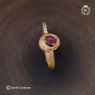 his is a contemporary gold finger ring featuring a unique, textured crescent-moon or partial-orb design at its center. The main feature is an oval-cut ruby or deep pink gemstone, securely set within the textured gold element. The ring’s band is smooth, with a small row of pave-set clear stones (likely diamonds or cubic zirconia) adorning…