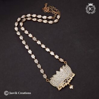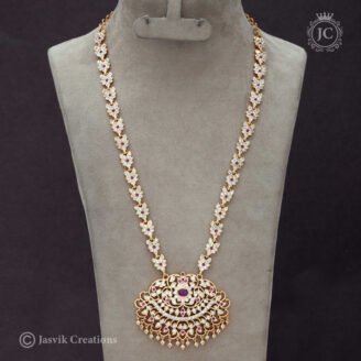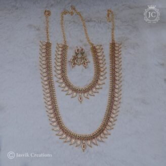 This is a lotus-inspired designer haram necklace from Jasvik Creations, crafted with elegance and intricate detailing. Design: The centerpiece features a beautifully carved lotus motif, symbolizing purity and grace, fully embellished with shimmering white stones. Chain: The haram chain is delicately designed with a sequence of floral-shaped links, each accented with sparkling stones, enhancing its…