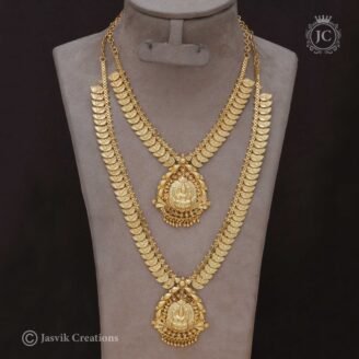 This is a traditional long chain (haram) featuring a grand, circular Lakshmi “Dollar” pendant set in an antique gold finish. The centerpiece features the deity Goddess Lakshmi in high relief, surrounded by a radiant halo of intricately placed American Diamonds (AD) for a rich, sparkling effect. The design is completed with classic temple jewelry accents,…