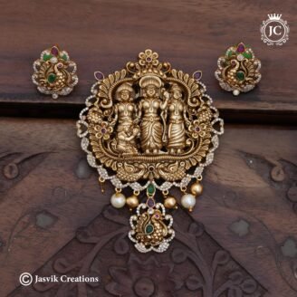 This stunning jewelry set features a Ram Parivar antique-finish pendant and matching earrings, blending traditional temple artistry with contemporary elegance. It is designed for those who appreciate intricate craftsmanship and spiritual symbolism in their accessories. Design Motif: The central pendant depicts the Ram Parivar (Lord Rama, Sita, Lakshmana, and Hanuman) in a beautifully embossed 3D…