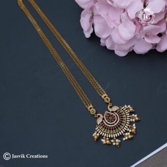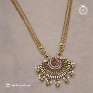 This Double Swan Ruby Dollar Chain (JCCH556) is a traditional South Indian statement piece that combines spiritual symbolism with regal craftsmanship. Often referred to as a “Dollar Chain,” it features a large, ornate pendant typically worn with long chains for festive and bridal occasions. Product Overview Design Motif: The central “Dollar” (pendant) features a Double…