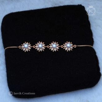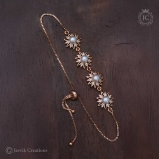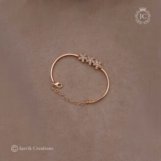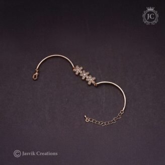 Design Highlights: Features a trio of intricately crafted floral motifs, each adorned with shimmering stones that evoke the brilliance of fine diamonds. The central floral cluster is framed by sleek, curved bands that contour elegantly around the wrist. Finished with a secure clasp and adjustable chain for a custom fit and added comfort. Material &…