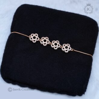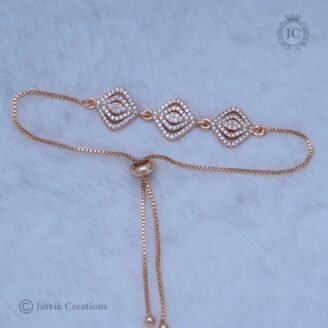 A symphony of sparkle and symmetry, this rose gold bracelet is designed to bring refined charm to every wrist it graces. Design Highlights: Features four diamond-shaped motifs encrusted with concentric rows of shimmering stones, creating a radiant focal point. Each motif is linked by delicate rose gold rings, offering fluidity and movement. The adjustable sliding…