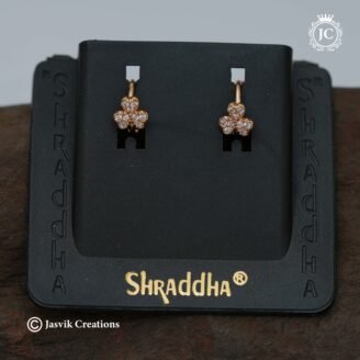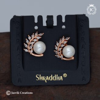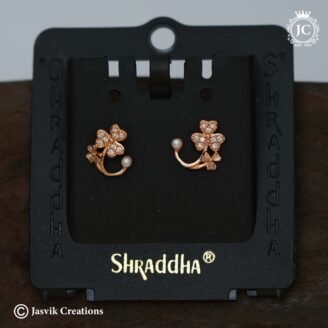 Petite Clover and Pearl Ear Climber Studs A charming and contemporary pair of cuff-style stud earrings featuring a warm rose gold-tone finish. The design centers on a detailed three-leaf clover or flower motif, intricately paved with brilliant American diamond (AD) or cubic zirconia (CZ) stones. A delicate curve extends from the main motif, terminating in…