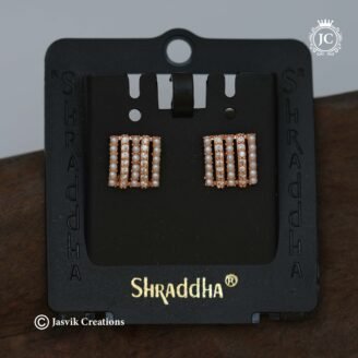 Contemporary Rose Gold Bar Stud Earrings A modern and geometric pair of square stud earrings with a sophisticated rose gold-tone finish. The design features a square frame composed of vertical rows alternating between sparkling American diamond (AD) or cubic zirconia (CZ) stones and delicate, miniature faux pearls. This striped, grid-like pattern gives the studs a…