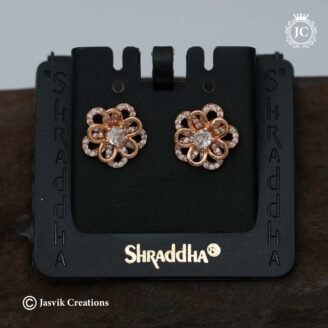 Sparkling Rose Gold Flower Stud Earrings A charming and brilliant pair of flower-shaped stud earrings with a warm rose gold-tone finish. Each earring features an openwork floral design: a large, clear American diamond (AD) or cubic zirconia (CZ) stone forms the center, surrounded by beautifully outlined petals that are paved with smaller, sparkling stones. This…