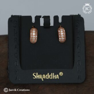 Pave CZ Rose Gold Huggie Studs A contemporary and brilliant pair of huggie-style stud earrings with a warm rose gold-tone finish. The design is a small, curved half-hoop shape, completely encrusted (paved) with rows of sparkling American diamond (AD) or cubic zirconia (CZ) stones. This full-pave setting ensures maximum brilliance and sparkle. Presented on a…