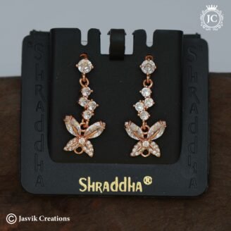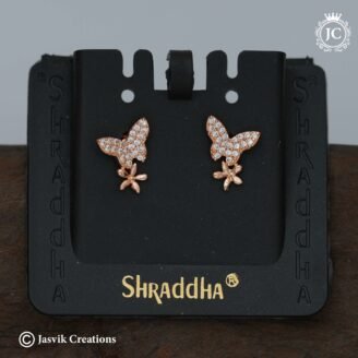 Elegant Rose Gold Butterfly Studs A delicate and radiant pair of butterfly stud earrings featuring a warm rose gold-tone finish. The design is formed by three sparkling, pear-shaped or marquise-cut American diamond (AD) or cubic zirconia (CZ) stones that create the wings, giving a light, airy, and brilliant effect. The butterfly’s body and wing outlines…