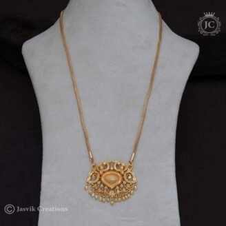 0 out of 5₹849Original price was: ₹849.₹499Current price is: ₹499.View this post on Instagram A post shared by Jasvik Creations (@jasvik_creation) A simple, gold-toned snake chain featuring an antique-finish pendant (Dollar) in a scallop/fan shape, entirely studded with ruby-red synthetic stones and finished with small drops.image_dd3728.jpgLakshmi Attikai Dollar SetA short, thick gold-toned snake chain carrying a large circular matte gold Dollar pendant featuring Goddess…