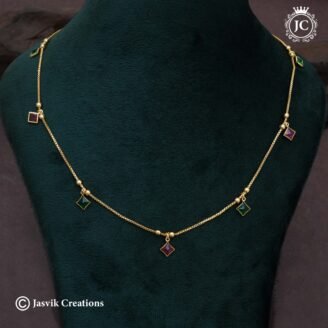 0 out of 5₹750Original price was: ₹750.₹350Current price is: ₹350.This is a delicate and minimalist gold-toned necklace. It features a fine, slender chain adorned with a series of small, geometric crystal-like stones. The stones are square or rhombus-shaped and appear in two colors: a deep red/maroon and an emerald green. The stones are interspersed along the chain, with a single small bead placed at…