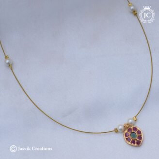 0 out of 5₹250Original price was: ₹250.₹170Current price is: ₹170.Design: The necklace features a thin, gold-toned wire or thread-like chain that makes the pendant and pearls appear to be floating. The central pendant has a unique, almost heart-shaped or leaf-shaped design. It is adorned with white and red stones and a central green stone, creating a pop of color. Small pearls or beads are…