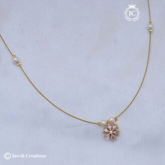 0 out of 5₹250Original price was: ₹250.₹170Current price is: ₹170.The necklace is a delicate and modern piece with a barely-there appearance, thanks to its thin, wire-like chain. Design: The chain itself is extremely thin and has a gold-tone finish. It features a small, central pendant in the shape of a flower. The flower is studded with sparkling white stones, likely American diamonds or cubic…
