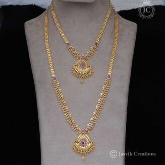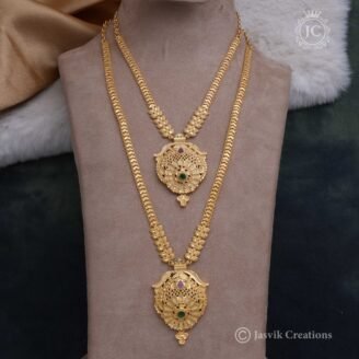 This is an exquisite and multi-layered “Haram,” or long necklace, that appears to be a traditional “Kerala Haram,” a style known for its intricate and layered design. The set is crafted with a rich, antique gold finish and includes a long necklace and a pair of matching earrings. The haram is a multi-layered piece that…