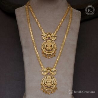 This traditional jewelry set features a Radha Krishna antique pendant paired with a micro-plated chain, combining spiritual significance with classic Indian craftsmanship. Product Overview Design Motif: The pendant (often called a “dollar” in South Indian terminology) showcases an intricate depiction of Radha and Krishna, symbolizing divine love and devotion. Pendant Artistry: These antique-style pendants often…