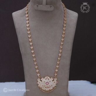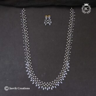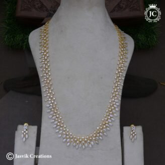 This piece of jewelry is a long necklace commonly referred to as a Haar or Harm (from the prompt’s reference) in Indian jewelry, paired with matching earrings. 💎 Key Features and Description Style: It features an all-over diamond/American diamond (AD) setting in a leaf or floral vine-like pattern. Length: It is a long piece (often…
