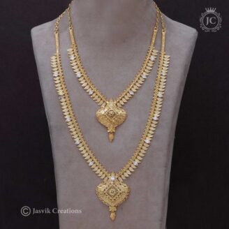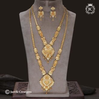 Product: A matching jewelry set consisting of two long necklaces (Haram) and a pair of coordinating dangling earrings. Design: The set features an attractive Forming/Machine-cut design with a bright, high-shine gold-like finish, giving the illusion of intricate hand-crafted gold. Motifs: The chains are interspersed with decorative units, often floral, leaf, or heart motifs, leading to…