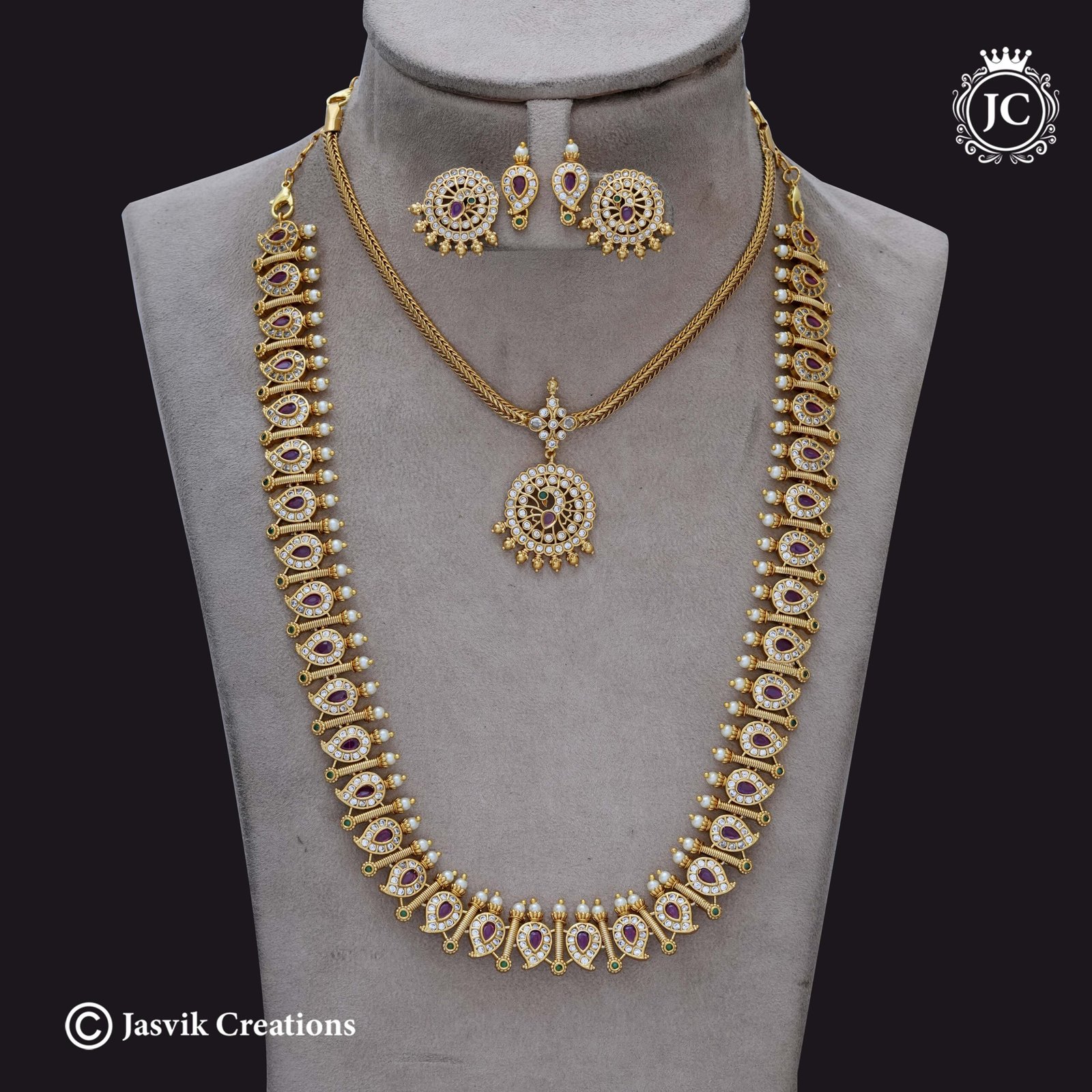 Combo Set: The set includes a long necklace (Haaram), a short necklace/choker, and a pair of matching stud earrings. Long Necklace (Haaram): Features a continuous, ornate chain of Paisley or Mango-leaf (Manga) shaped links. Each link is set with clear American Diamonds (AD/CZ) surrounding a central pink/ruby-colored stone. Small green accent stones and tiny pearl…