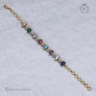 Features a sequence of multicolored gemstones—pink, green, red, white, blue, and purple—each framed by delicate white pearl halos. Set in gold-toned metal links, the stones are arranged symmetrically for a balanced, eye-catching display. Finished with a secure chain-link clasp for adjustable comfort and graceful wear. Material & Finish: Micro-plated gold base offers a rich, antique…