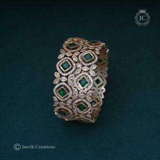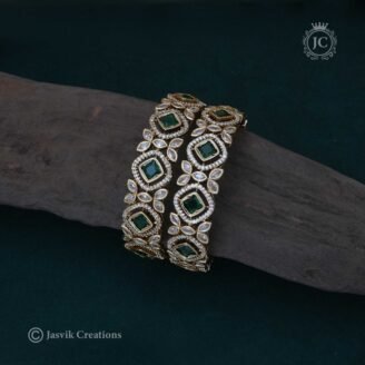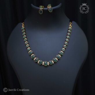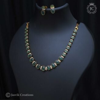 Step into timeless elegance with this Victorian Necklace Set from Jasvik Creations. Crafted in gold-toned metal, the design features lush green oval stones framed by delicate white accents, arranged in a graceful, symmetrical pattern. Paired with matching earrings, this set exudes regal charm—perfect for formal occasions, evening wear, or bridal ensembles that call for vintage…