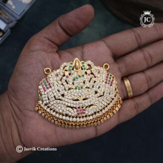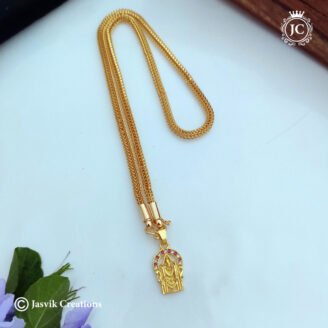 This is a traditional and devotional short chain necklace featuring a pendant of Lord Venkateswara (also known as Lord Balaji or Tirupati Balaji). The product code is JCCH419. Key Features: Chain: The chain has a “net” or “mesh” design, which is a textured, flexible style made of closely linked golden wires. This gives the chain…