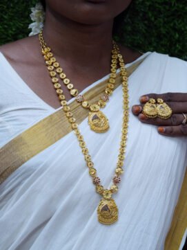 ₹799 – ₹899Price range: ₹799 through ₹8990 out of 5Impon: This is a key term. “Impon” is a Tamil word that means “five metals” or “Panchaloha.” It’s a traditional alloy of five metals (gold, silver, copper, iron, and lead) that is widely used in South Indian jewelry and statues. In modern imitation jewelry, “impon” often refers to a high-quality, long-lasting gold-plated finish that mimics…